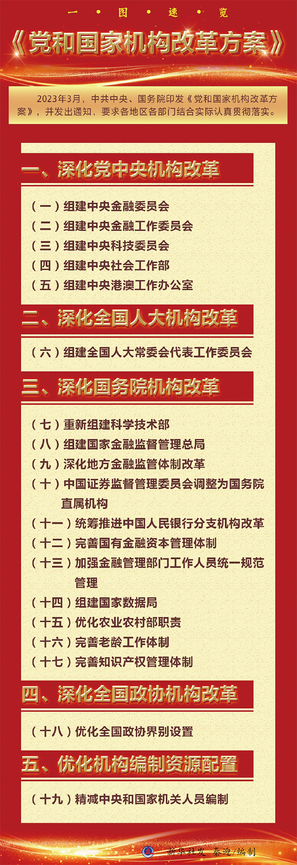 組建中央金融委員會、中央金融工作委員會、中央科技委員會、中央社會工作部、中央港澳工作辦公室;設立全國人大常委會代表工作委員會;重新組建科學技術(shù)部、組建國家金融監(jiān)督管理總局、深化地方金融監(jiān)管體制改革;全國政協(xié)界別增設“環(huán)境資源界”……在以習近平同志為核心的黨中央堅強領(lǐng)導下,黨和國家機構(gòu)改革正在平穩(wěn)有序推進。